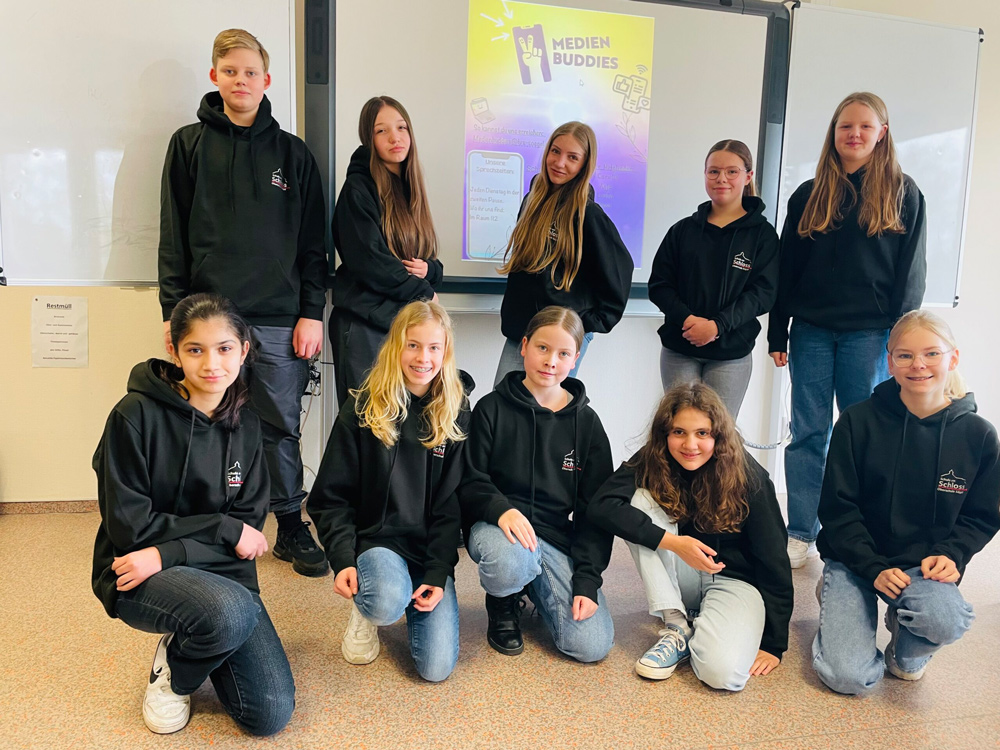 Im August 2023 starteten elf SchülerInnen des JG 7 und 8 der Schule am Schloss mit einem Workshop im LWH in Lingen ihre Ausbildung zu Medienbuddies. In 5 AG-Nachmittagen unter der Leitung von Katrin Wobben standen in der Schule fünf Themen im Mittelpunkt: Algorithmen, Datenschutz, Cybermobbing, Fake News und Hate Speech.