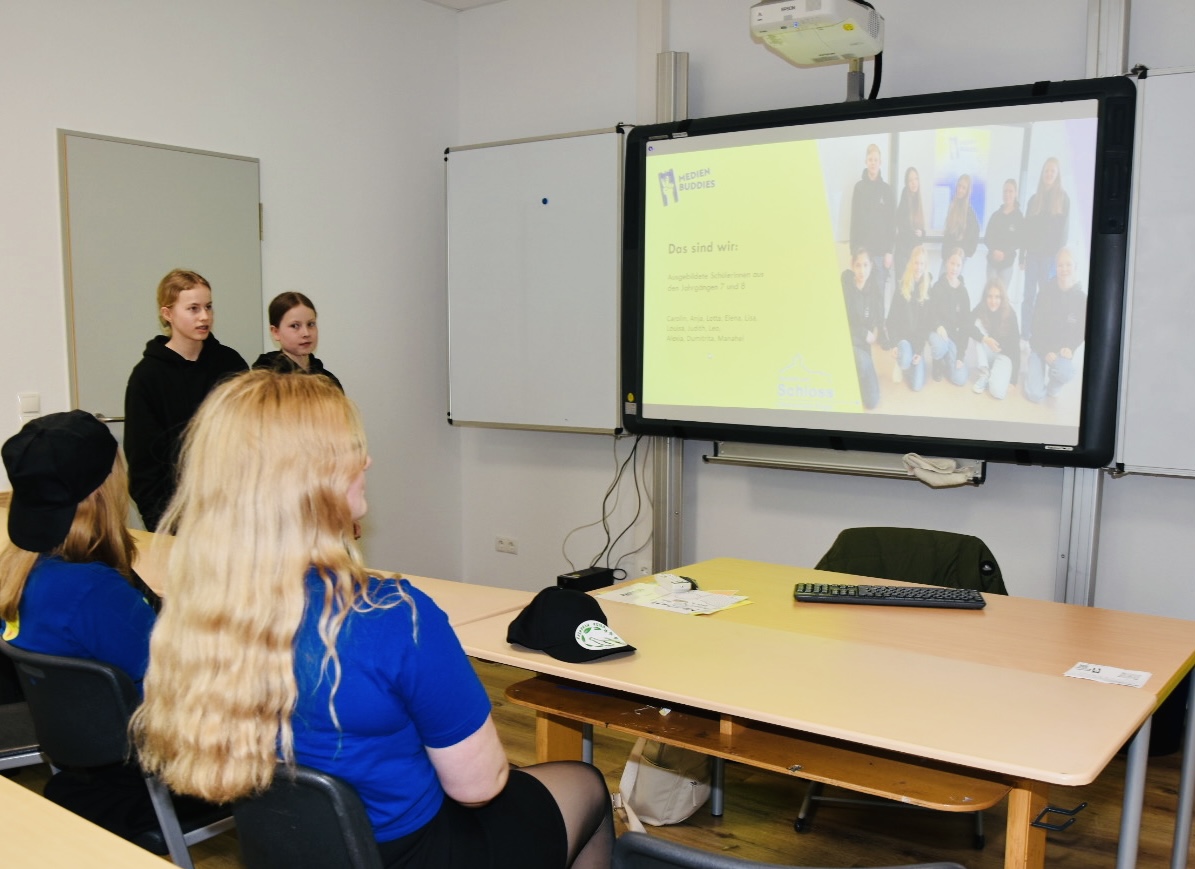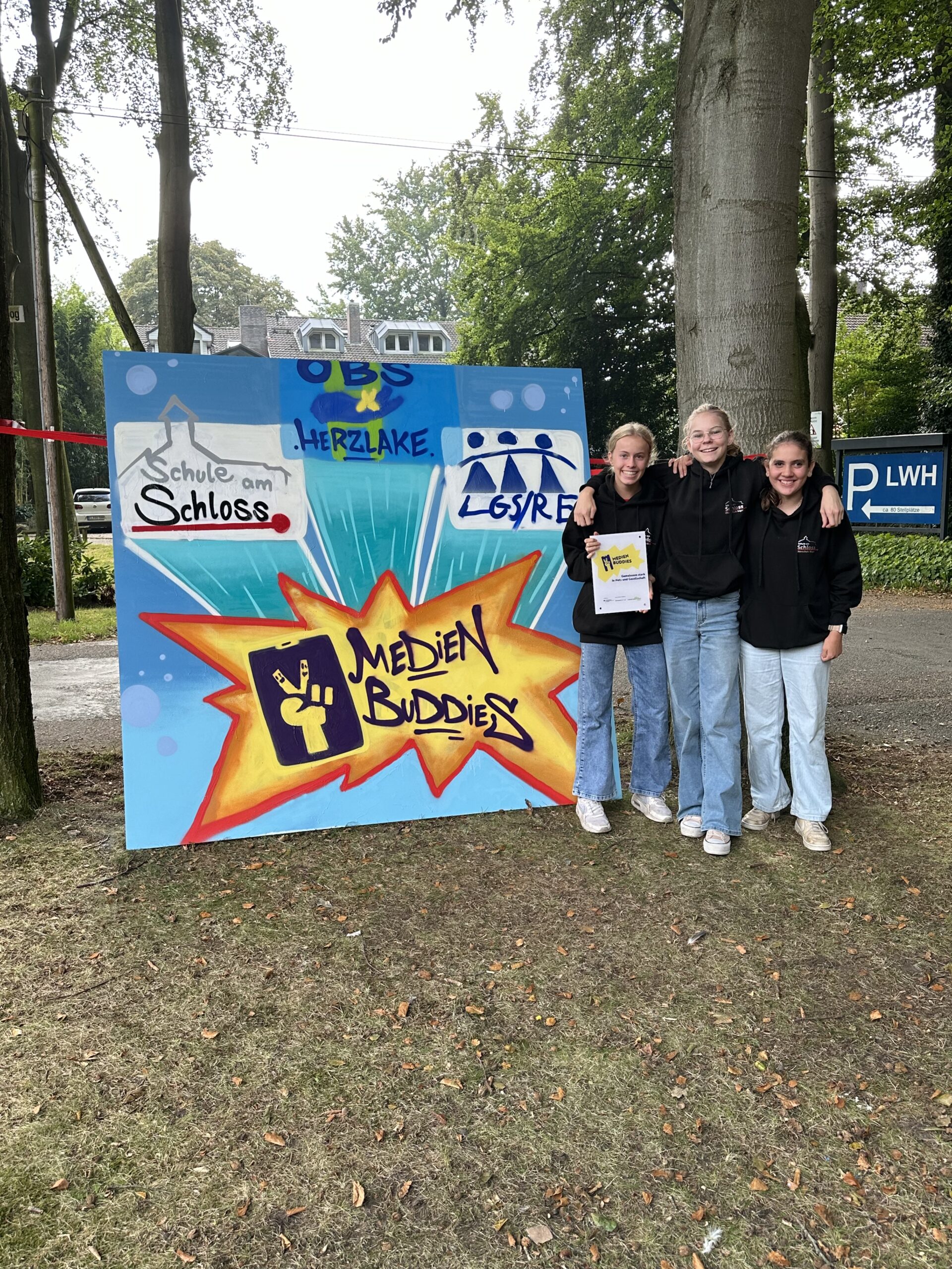 Im August 2023 starteten elf SchülerInnen des JG 7 und 8 der Schule am Schloss mit einem Workshop im LWH in Lingen ihre Ausbildung zu Medienbuddies. In 5 AG-Nachmittagen unter der Leitung von Katrin Wobben standen in der Schule fünf Themen im Mittelpunkt: Algorithmen, Datenschutz, Cybermobbing, Fake News und Hate Speech.