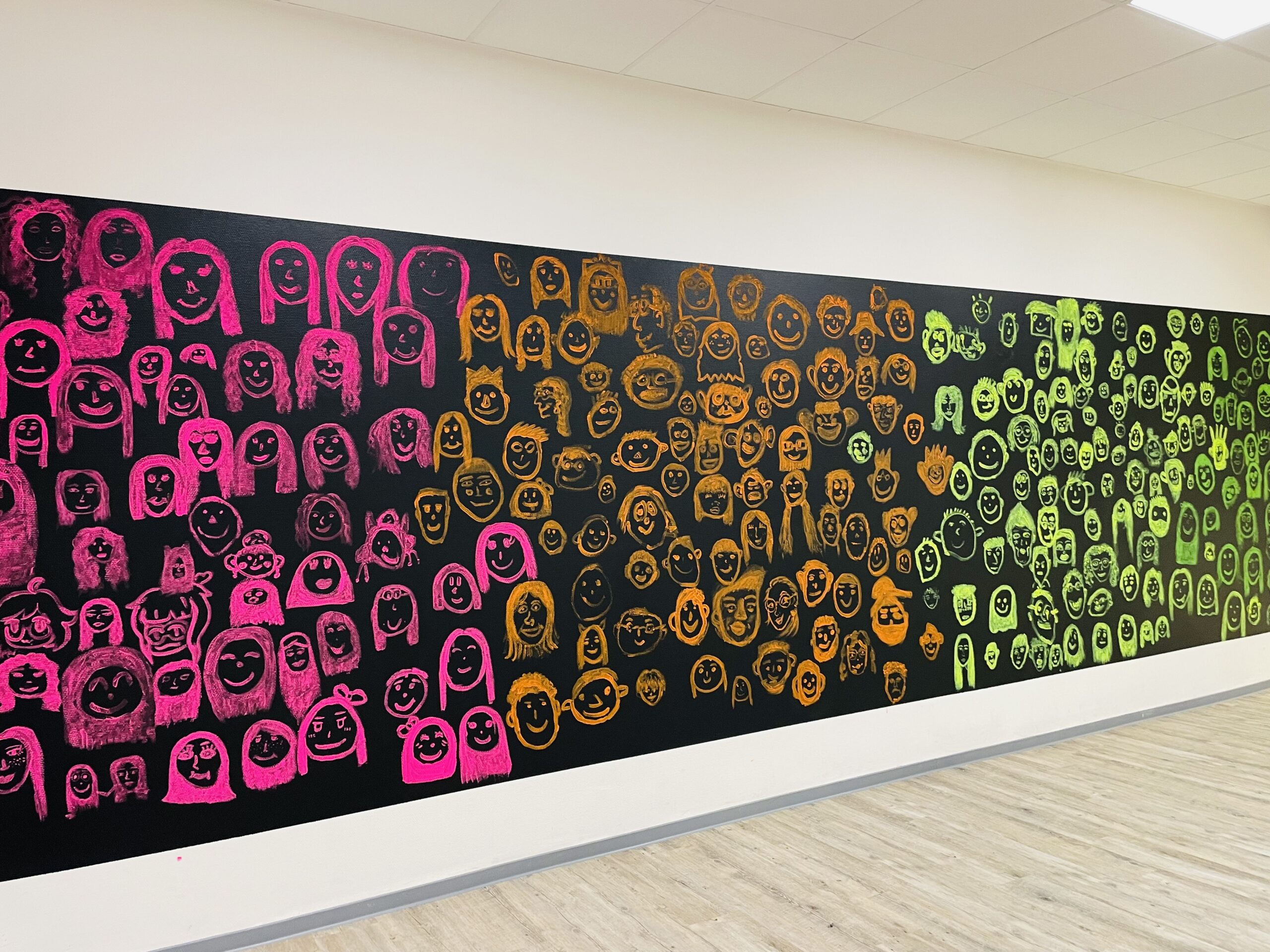 Beim Kunstprojekt zum Motto „Ich bin ein Mensch! Einer von vielen, aber einzigartig!“ malten sowohl SchülerInnen, MitarbeiterInnen und Lehrkräfte der Schule am Schloss unter der Leitung der Kunstlehrerin Christine Pleus mit leuchtenden Farben ihre Selbstporträts an eine Wand im Neubau. Im Laufe einer Woche fanden auf der ca. 32 m² großen schwarzen Fläche über 500 Gesichter ihren Platz. Vielen bereitete es sichtlich Freude, sich so in ihrer Schule verewigen zu dürfen. In Regenbogenfarben ist das große Wandbild nun ein Hingucker für alle, die den Bereich vor der Schulsozialarbeit betreten.