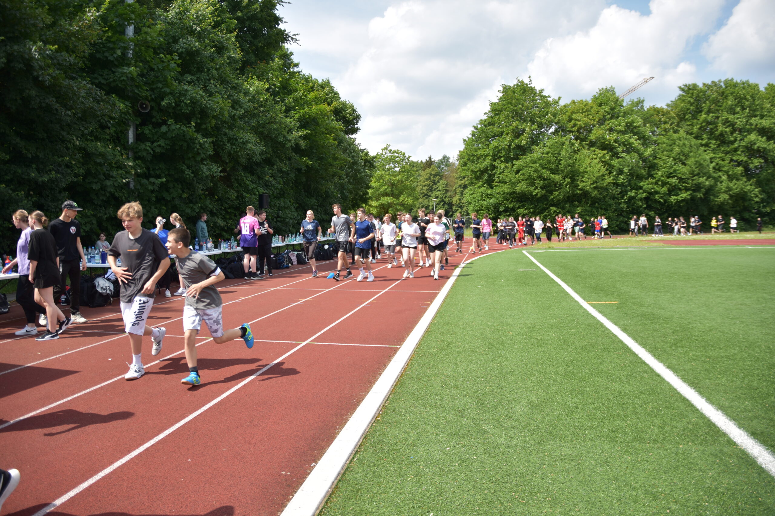 Auch in diesem Jahr organisierten die Sportfachkräfte am 24. Mai 2024 den sogenannten Stundenlauf. Unterstützung erhielten die Schülerinnen und Schüler der Schule am Schloss von einigen Lehrkräften, welche sie auf der 400-Meter-Tartanbahn begleiteten. Sonnenschein und zwei DJs motivierten und halfen ungemein beim Durchhalten.