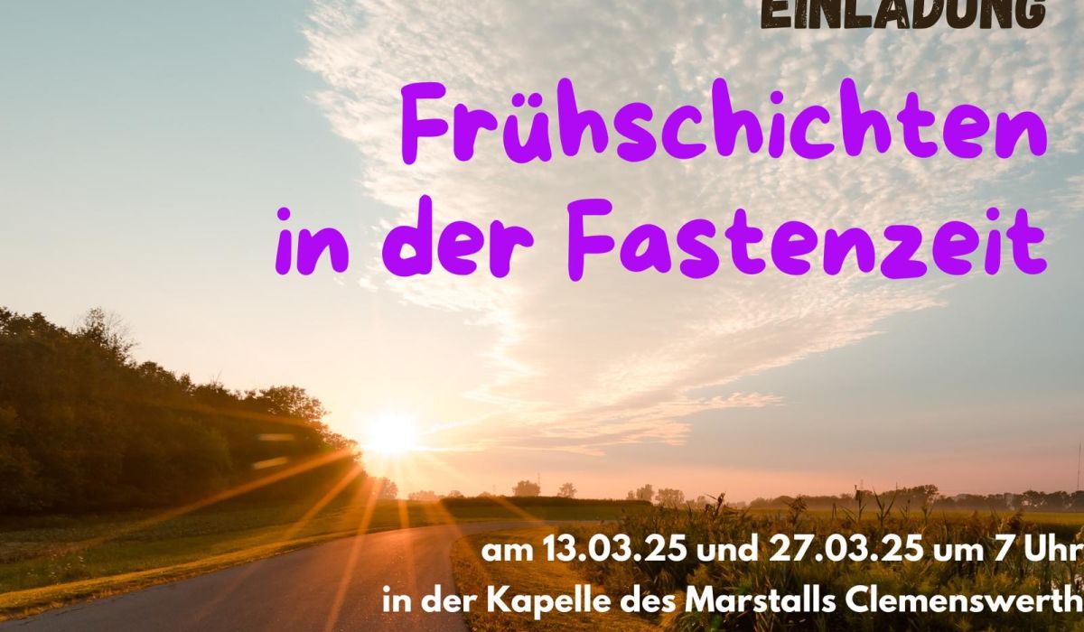 In der Fastenzeit finden am 13.03. und 27.03. um 7 Uhr die Frühschichten im Marstall Clemenswerth statt. Diese Veranstaltungen bieten eine Gelegenheit, den Tag in einer besinnlichen Atmosphäre zu beginnen und sich auf die Fastenzeit einzustimmen.