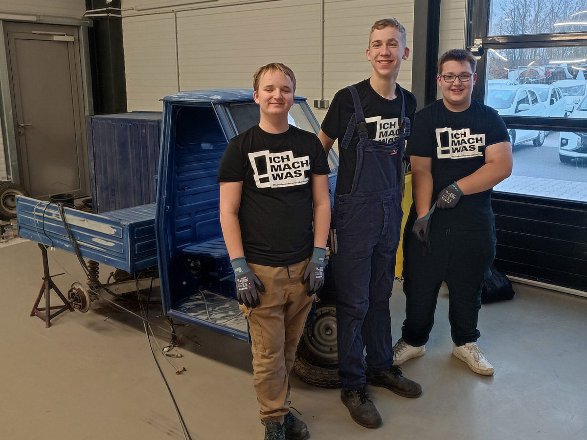 Jugendliche richten im Rahmen des Handwerkswettbewerbs „MACH WAS!“ von Würth unter der Schirmherrschaft der Aktion Modernes Handwerk e. V. eine Ape wieder her